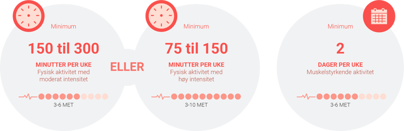 Det anbefales at personer i alderen 18 år og eldre bør gjøre minst 150-300 minutter med aerob fysisk aktivitet med moderat intensitet ukentlig ELLER 75-150 minutter med høy intensitet ukentlig.