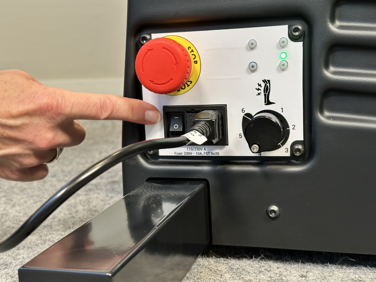 Before plugging in the device, control the tension on both belts. 4-6mm is accepted. Remove hands and plug in the device and start the motor. Visually control that the skipping and jumping of the belt is gone.