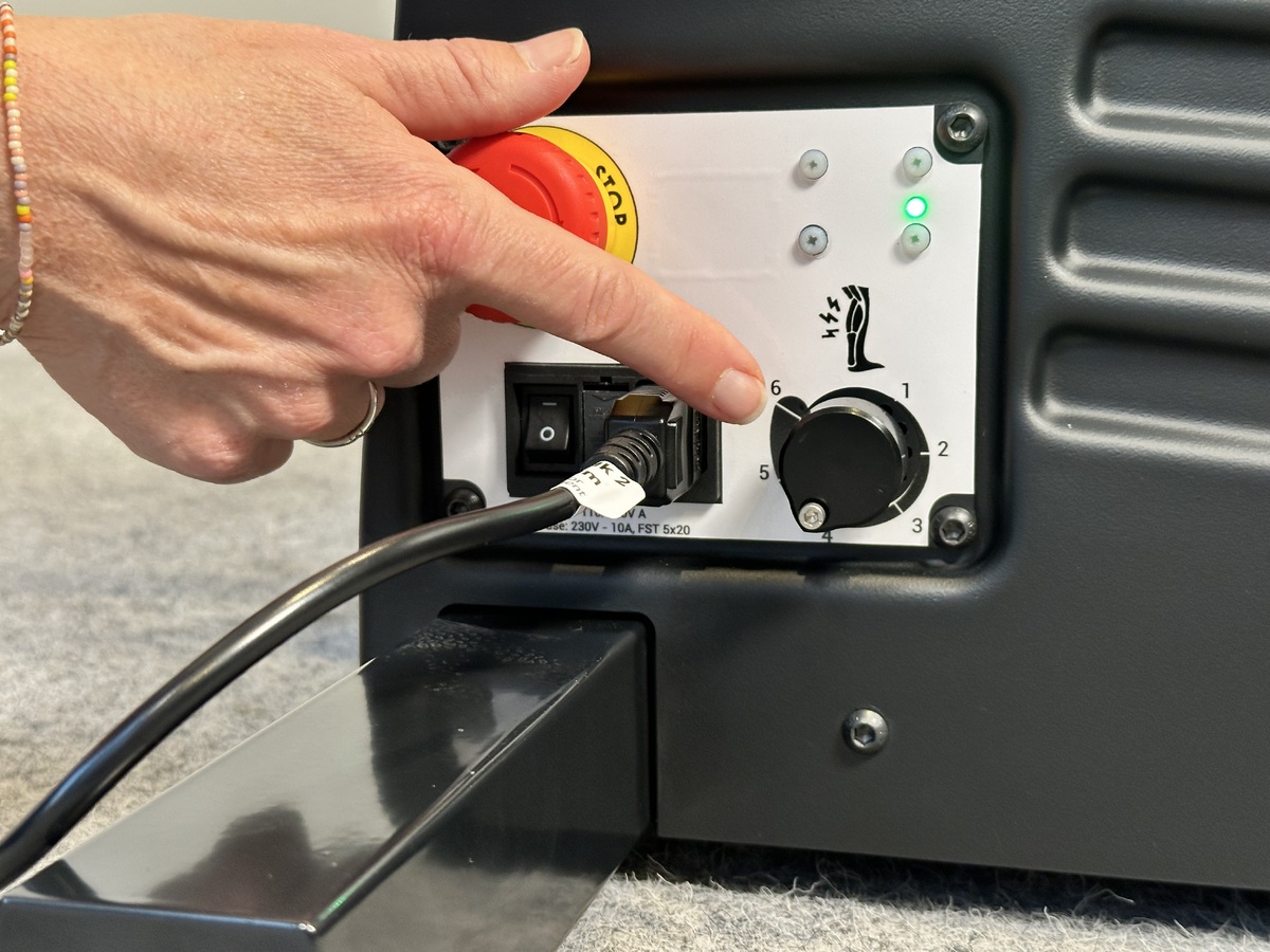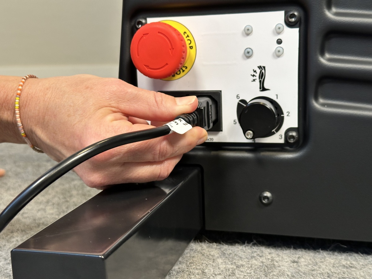 Place the right side cover as shown in the video. Flip it onto its side and first connect the black wire to the power inlet. This might take some force to properly put in place. Insert the red wire into the emergency stop and thighten firmly with the star bit. Pull on the wire to make sure its properly in place. Conform also again that the black wire is properly in place.